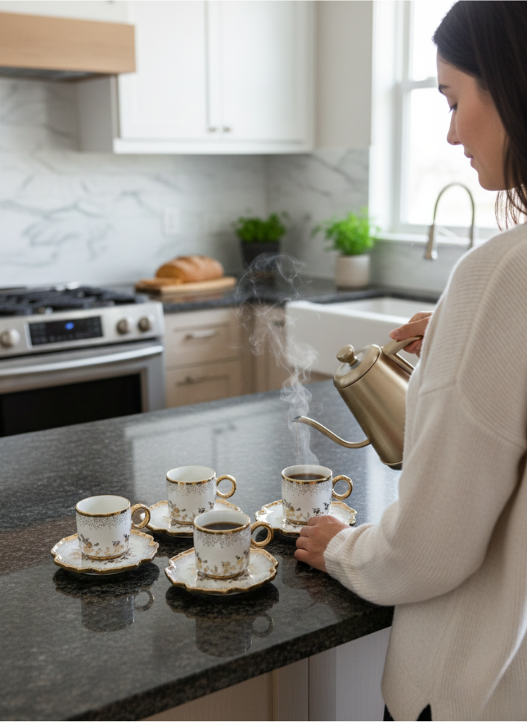 Service à café / thé en porcelaine dorée – 6 tasses et soucoupes Plage de prix : د.ت80.000 à د.ت110.000